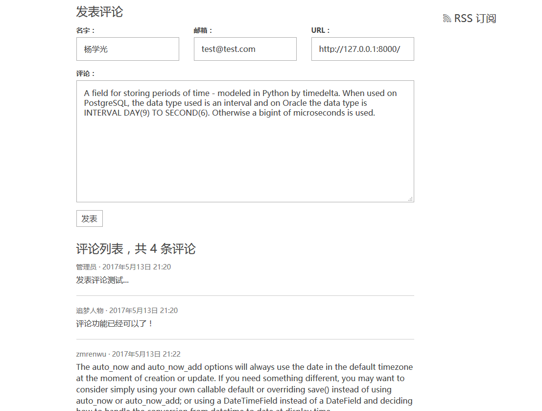</ul>接下来尝试在详情页下的评论表单提交一些评论数据,可以看到详情页的评论列表处渲染了你提交的评论数据。