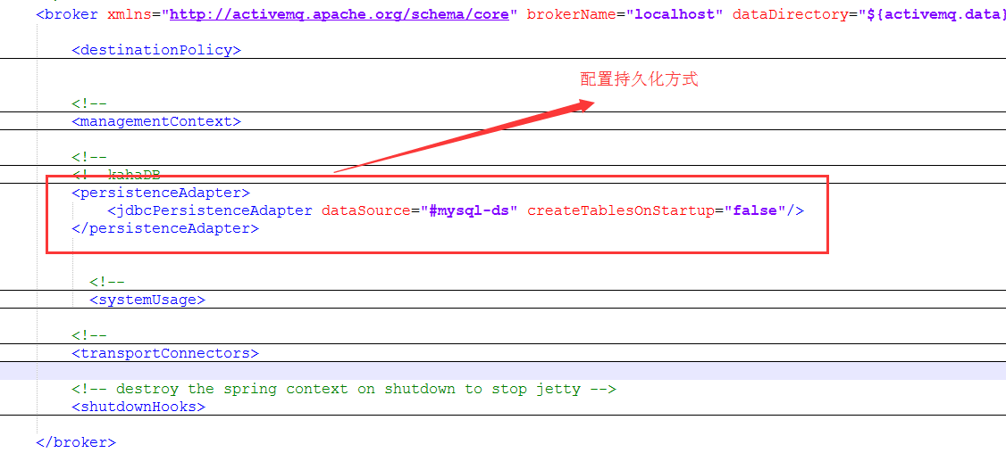 <broker> <persistenceAdapter> <!--createTablesOnStartup="true"表示在第一次启动时自动建立表结构,再次启动时,应该改为false--> <jdbcPersistenceAdapter dataSource="#mysql-ds" createTablesOnStartup="true"/> </persistenceAdapter> </broker>