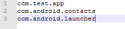 第一步建立黑白名单文件,黑白名单文件为文本格式,里面存储的是要列入黑白名单的包名,用回车换行区分,一行一个包名,比如创建黑名单black.txt: