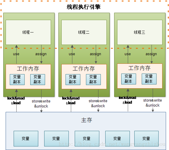 JMM定义了八个操作来完成工作内存与主存的通信。假如一条线程准备对一个变量进行新的赋值操作,它可能会先用lock操作锁住主存中的某个变量(不让其他线程获得此变量的锁,直至使用unlock操作释放该变量的锁),接着使用read操作将变量从主存独到工作内存,紧接着load操作将得到的变量值放到工作内存中的变量副本,use操作则将变量值传给线程执行引擎进行运算操作,assign操作把新的变量值从线程执行引擎中传递到工作内存,继续往下,store操作则把变量值从工作内存传送到主存中,接着write操作将得到的值写入主存相应的变量中,最后使用unlock操作释放变量的锁。