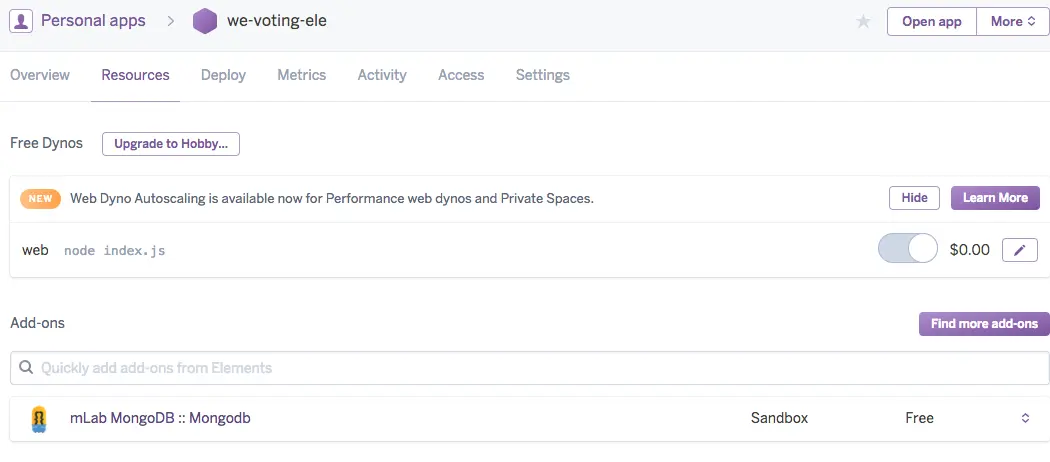 heroku create <yourAppName>创建 App,这里的appName也是你在herokuapp.com下的三级域名heroku create we-voting-ele - 推送代码到 heroku 进行发布