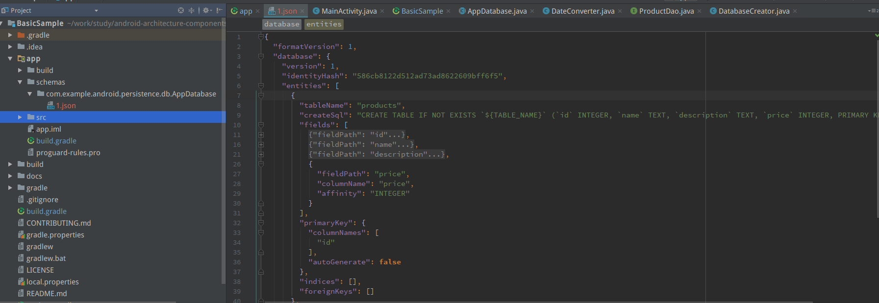 - Database: 可以使用此组件创建数据库 holder,注释定义实体列表,和类的内容定义数据访问对象(DAO)数据库中的表。它也是基本连接的主要访问点。