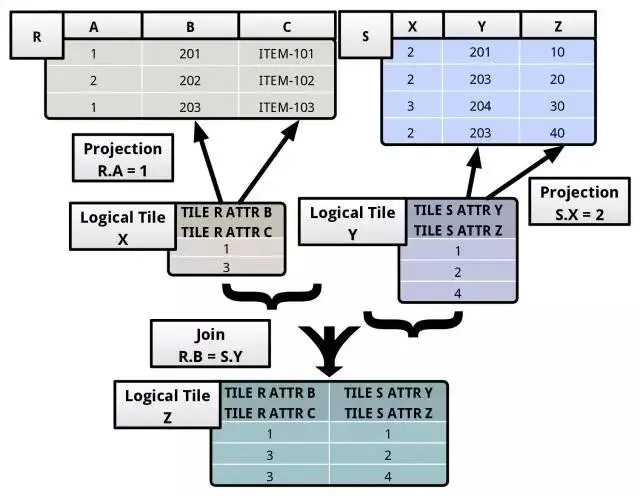Pipeline Breakers:当我们给一个 query plan 生成对应的 query plan tree 之后,在 tree 上层的 operators 需要等待 children 的操作完成返回了,才能继续进行。譬如 join operator 需要处理多个 logical tiles,并且在这些 tiles 上面执行 predicate。首先,join operator 会构建一个 output logical tile,它的 schema 是根据输入的 logical tile 来构建的。然后 join operator 会遍历 input logical tile,如果发现满足 predicate,就将结果放到 output logical tile,下面是 join 的一个例子: