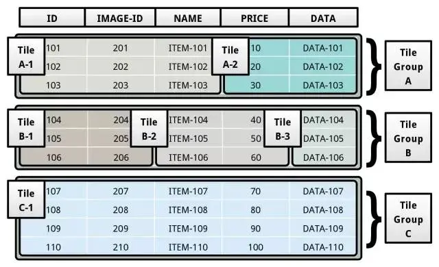 在上面的例子中,table 被分成了三个 tile group (A, B, C),每个 group 都有不同的 physical tiles。譬如 group A 就是由 tile A-1 和 A-2 组成,tile A-1 包含 table 前面三个 column ID,IMAGE-ID,和 NAME,而 tile A-2 则包含了 PRICE 和 DATA。