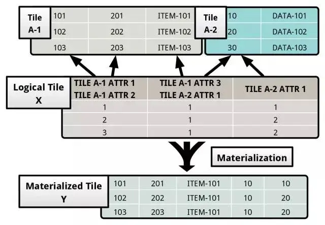 一个 logical tile column 也可以映射不同的 physical tile 的 columns。譬如上面 X 的第二个 column,就是对应的 tile A-1 的 ATTR-3 和 A-2 的 ATTR-1。当然一些 physical tile column 也可能不会有任何映射,譬如上面的 A-2 的 ATTR-2。