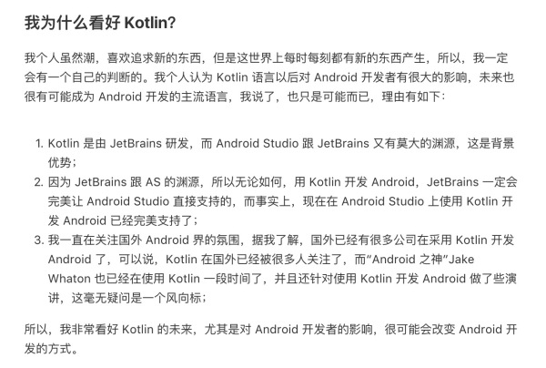 当然我不是想证明我是预言家,只能说我对技术趋势的认识还是可以的,我对未来趋势判断的准确率高点,对读者的误导就会少点,我虽然看好 Kotlin,但是怎么也没想到 Google 竟然这么快就和 JetBrains 达成一致,这动作快的令人惊奇。