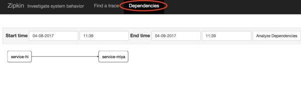 再打开http://localhost:9411/的界面,点击Dependencies,可以发现服务的依赖关系:
