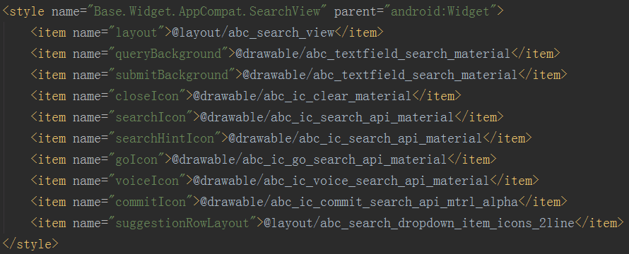 搜索框中左边的搜索图标不是一个控件,所以没办法通过id得到,但好在可以通过设置style的方式来修改SearchView所有的图标。方法也很简单,只需创建一个style(这里取名Widget.SearchView)继承自Widget.AppCompat.SearchView,然后替换需要修改的属性即可。先看下Widget.AppCompat.SearchView的父级Base.Widget.AppCompat.SearchView吧: