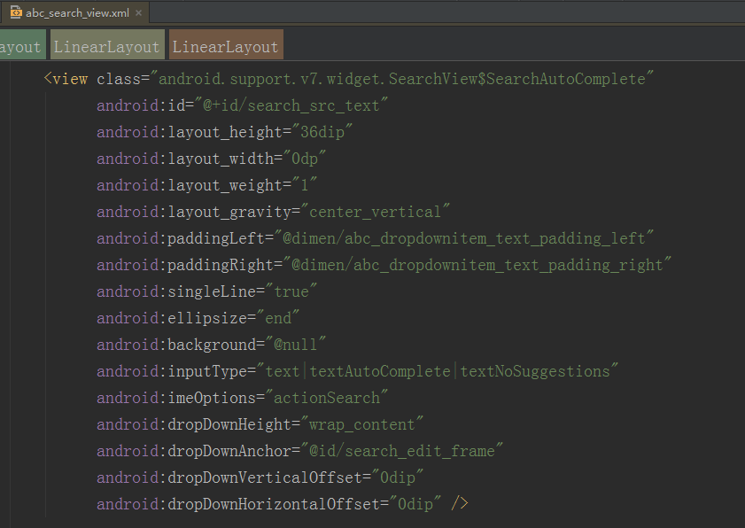 可以看到,这个父级style提供了SearchView中几乎所有的Icon属性,这意味着在图标定制上可以有很大拓展性。其中,layout是指定SearchView的布局,原始布局就是abc_search_view.xml,我们一般不会去动这个属性。 这里我们只需要去掉搜索框左边的图标(即:searchHintIcon),直接设置为@null就好了,如下修改style文件中的Widget.SearchView主题: