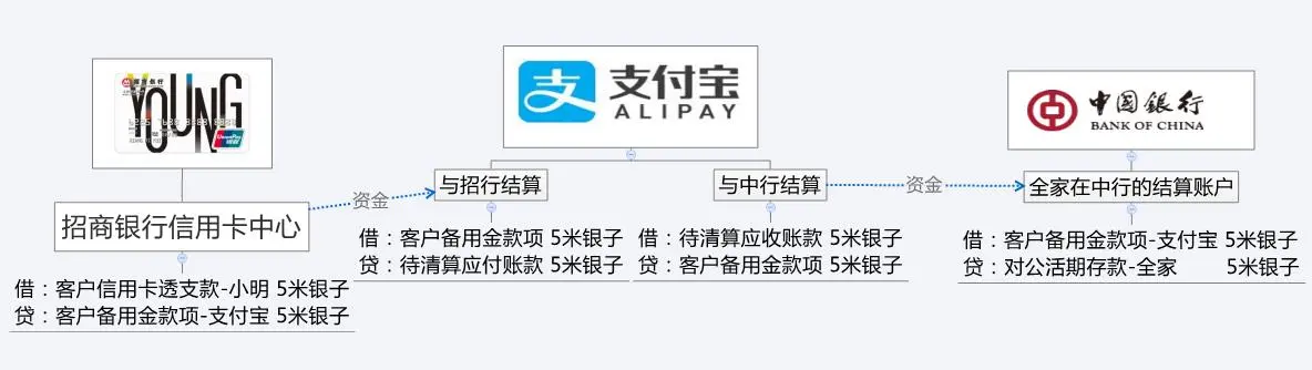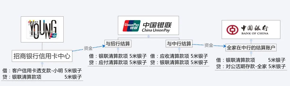 场景2:小明通过招行信用卡刷卡支付,全家的结算账户依然在中行。