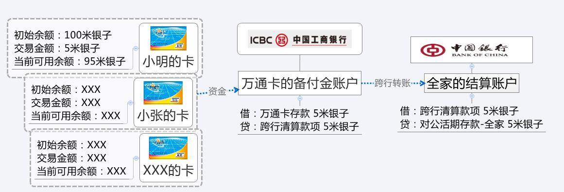 场景1:小明通过万通卡付款,假设万通卡的结算账户开在工商银行ICBC,全家的结算账户开立在中行。