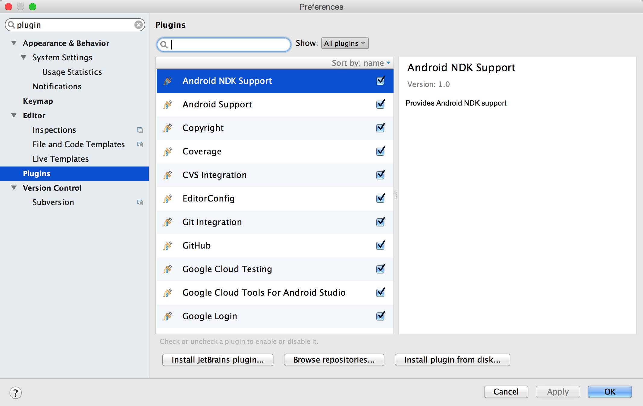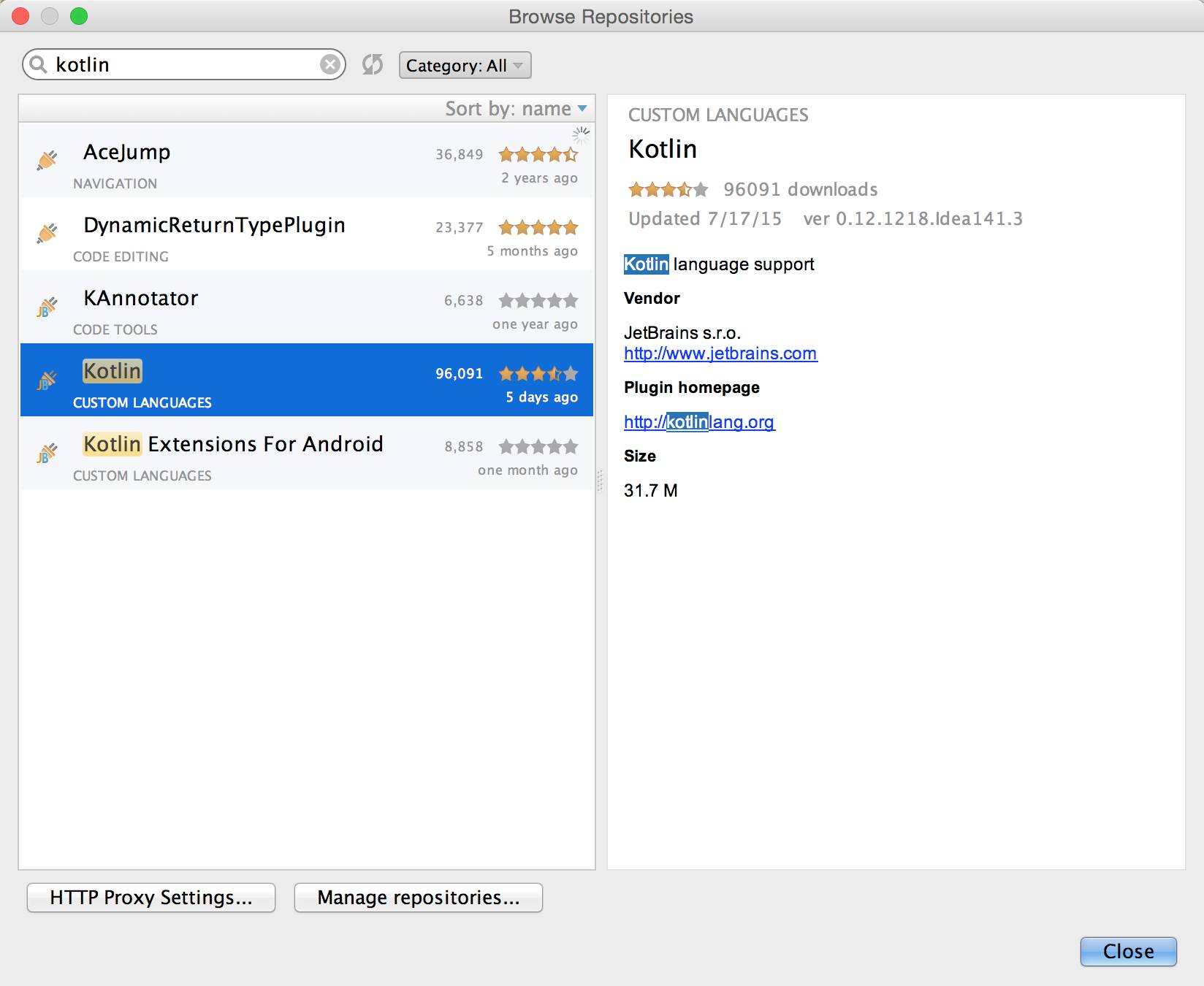1、启动AndroidStudio,command+,打开Preference(windows下请自行查找相应快捷键),搜索plugin,打开插件界面,点击BrowseRepository,搜索Kotlin,双击安装Kotlin和Kotlin Extension For Android。第一个是Kotlin语言支持包,第二个是我们稍后会用到的特性的增强包,Android Studio2.0以后已经将两个插件合并为一个合并为一个。