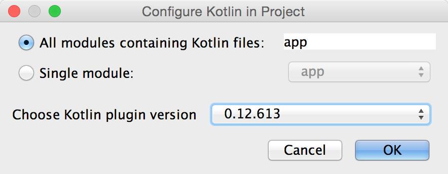 3、点击Tool->Kotlin->Configure Kotlin in Project (这里顺带说一下,网上很多教程都说需要手动配置build.gradle,只是这些文章是很早以前的了,现在开发Kotlin早就可以用AS一键配置了)我们选择最新的0.12.613版本(也许你会在网上看到很多Kotlin M12,M11等名词,那就是指这里的0.12类似于Android17,Android22,Java8,这样的版本称呼)。