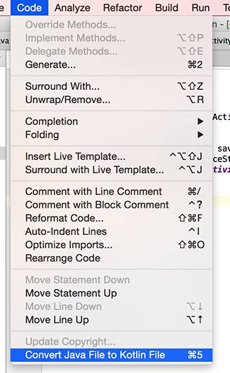 2、有了语言支持包,我们就可以新建一个Android工程了。新建好一个普通Android工程后,点击Code->Convert Java File to Kotlin File。默认的快捷键有点冗长,这里我直接将快捷键设置成command+5,以后转换起来就方便很多了。