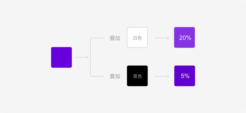 在交互行为中需对色彩做变化时,建议采取在颜色上添加黑色或者白色并按照 n+5% 的规律递增的方式来实现。以下图为例,当鼠标 hover 某个特定元素,就视为浮起,对应颜色就相应增加白色叠加,相反点击的行为可以理解为按下去,在颜色上就相应的增加黑色的叠加。