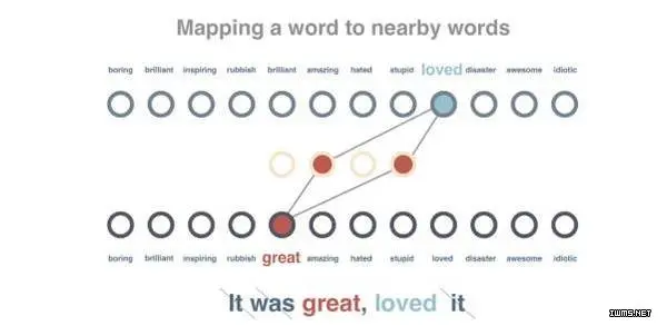我们继续对这个图表进行训练,让相同上下文中出现的词语可以获得类似的向量表征。我们会对这些句子进行预处理,移除所有停用词(Stop word)并实现标记化(Tokenizing)。随后一次传递一个词语,尽量缩短该词语向量与周边词语之间的距离,并扩大与上下文不包含的随机词语之间的距离。