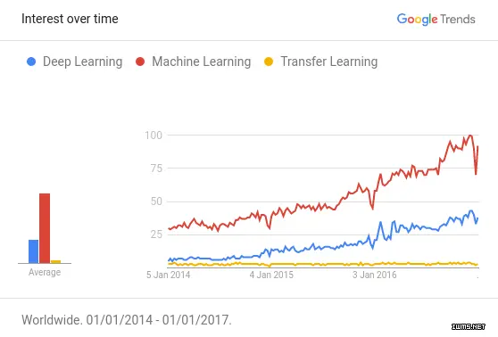 谷歌搜索中,机器学习、深度学习,以及迁移学习三个关键字的搜索趋势变化