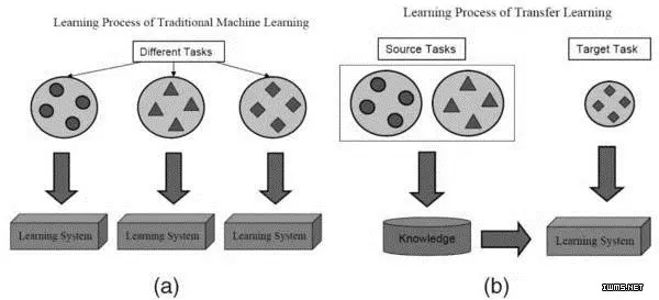 在面对某一领域的具体问题时,通常可能无法得到构建模型所需规模的数据。然而在一个模型训练任务中针对某种类型数据获得的关系也可以轻松地应用于同一领域的不同问题。这种技术也叫做迁移学习(Transfer Learning)。