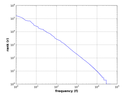 即使由齐普夫定律描述的数学关系不一定完全准确,但它依然对于人类语言中单词分布的刻画很有用——词序小的词很常出现,而稍微词序大一点的则较为少出现,词序非常大的词则几乎没有怎么出现。任务 1 最后一部分使用 NLTK 非常容易通过图形进行可视化,如 清单 1a 所示。相关的 log-log 关系,如图 1,可以很清晰地发现我们语料库中对应的扩展关系。
