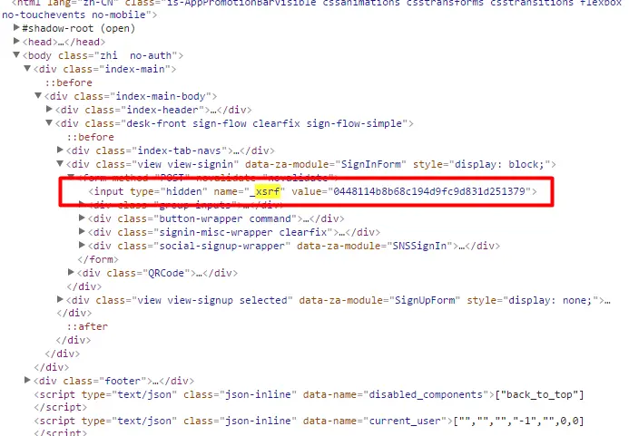_xsrf是什么?在我事先准备的“参考资料”里说是一串伪随机数, 是用来防止跨站请求伪造的。 什么意思呢?我也看不懂。 但是要得到这个值其实并不难,它其实隐藏在页面的某个标签中