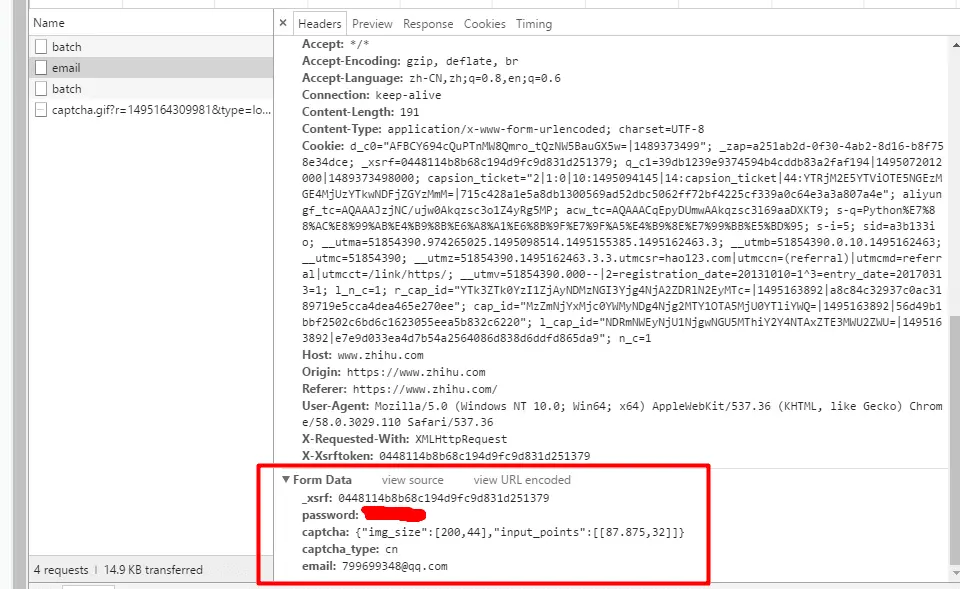 password和email是密码和登陆的邮箱账号,_xsrf上面也说过了。captcha是4位由字母和数字组成的验证码, 需要先将验证码图片下载到本地, 然后人眼识别(是的你没看错)