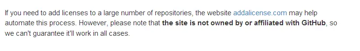 最后我选择了Apache v2 License。至于如何添加,一个方法是在GitHub创建Repository的时候选择添加(这个我一开始就忘了),第二个是使用官方推荐的 www.addalicense.com 来给当前存在的Repository添加,然而