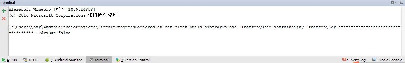 6. 在AndroidStudio的Terminal里输入这些命令(Key里面的星号的内容实际上应该是我们的API KEY,我这里屏蔽掉而已。注意每行命令之间用一个空格隔开,这个很重要),最后回车提交: