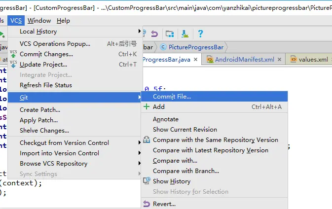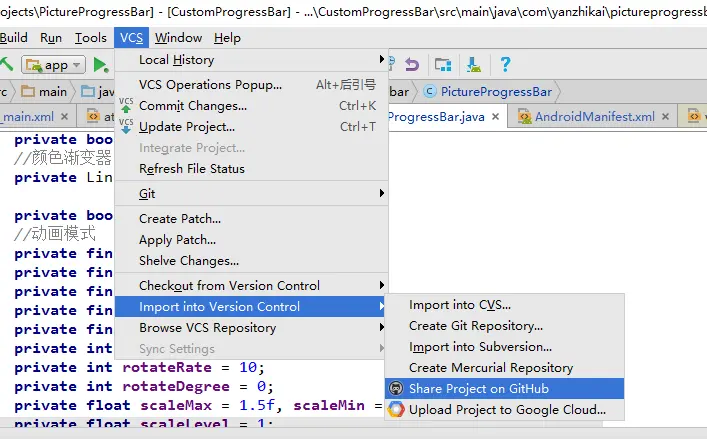 这个我相信大家都很熟悉,我这里就简单的列出一下我把这个项目上传到GitHub(我是使用AndroidStudio上自带的功能,简单方便)的步骤吧: