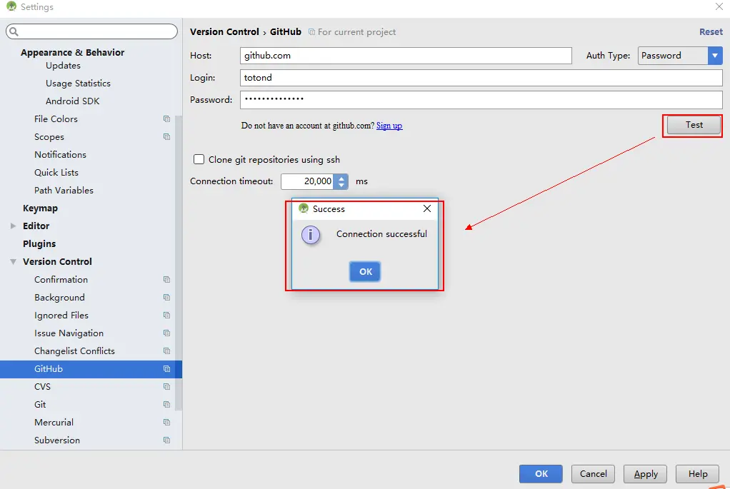 - 在Setting配置你的GitHub账号信息,没有的可以注册,那里有按钮(我这个是AndroidStudio2.2版本,不同的版本可能里面的内容有一点不同),输入完账号密码按Test连接一下,失败的确认好账号密码多试几次,把timeout设置长点