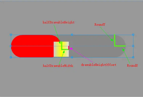 接下来是画图片Drawable的方法,这个Drawable可以是图片或者是Shape,根据当前进度的中心点坐标x、y和图片的半宽高属性halfDrawableWidth、halfDrawableHeight来实现,其中drawableHeightOffset是图片的高度偏移量: