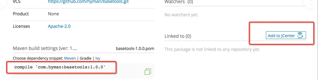 7. 成功了之后,可以在网页上看到你的项目,左下可以看到如何添加依赖,右下角会有一个Add To jcenter(因为这个项目早已经add了,所以借用一下鸿洋大神的图片),本项目JCenter地址:bintray.com/yanzhikaijk…