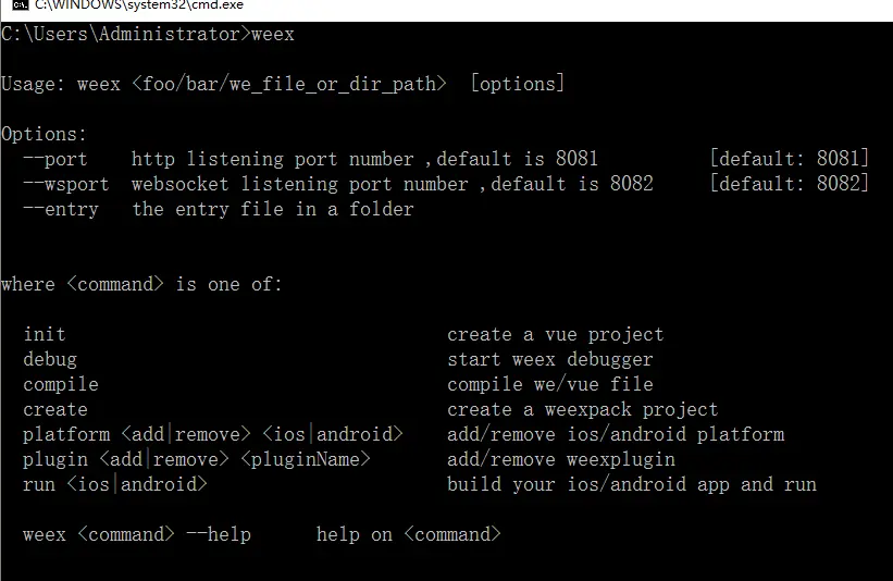 安装结束后你可以直接使用 weex 命令验证是否安装成功,它会显示 weex 命令行工具各参数: