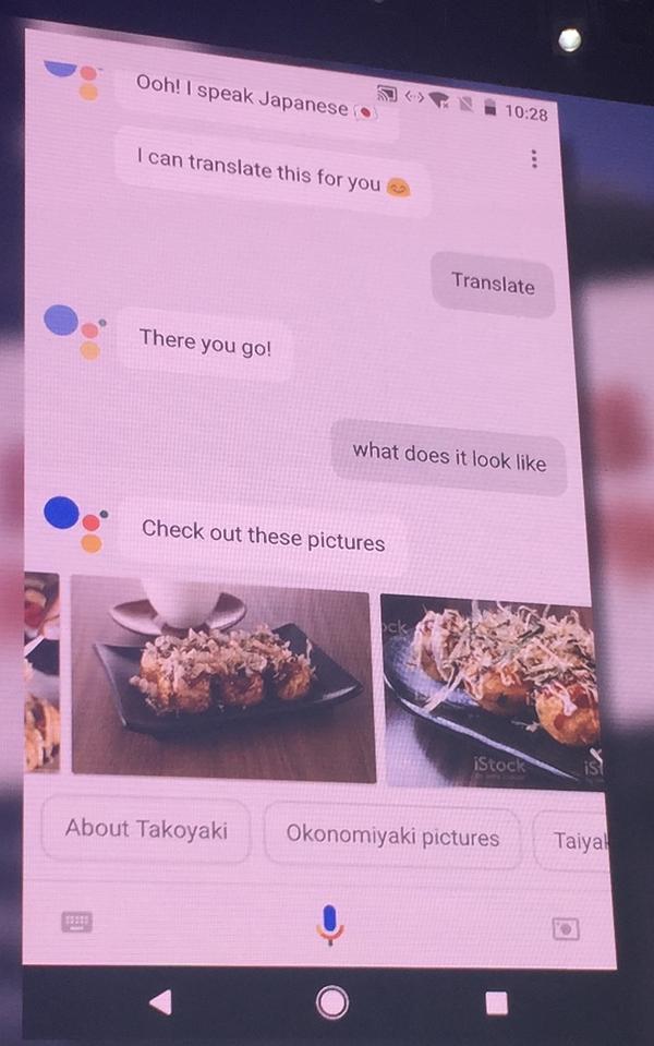 你给Google 助手看了一个饭店的海报,上面有莫名其妙的日文,然后你不需要说日文,不需要打日文,不需要知道他的翻译,简单几句对话,你就知道这个莫名其妙的日文究竟是什么样的食物,是不是很棒?这样的对话还是很难得,例如说 translate ,说what does it look like 的时候,Google助手必须知道指什么对象,所有这些信息又都是从图片中提取出来的。可见我们平时对话的时候有多少东西是省略的,不仔细想想,都完全意识不到。