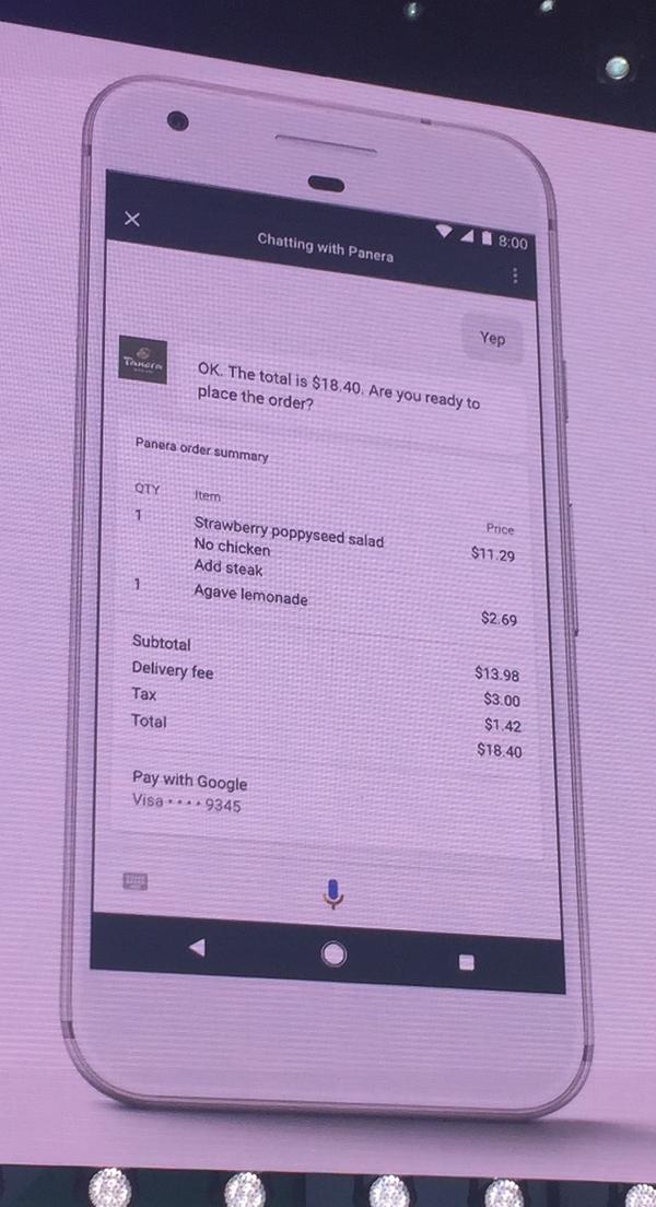 还是之前那句话,仅仅是理解图片内容并没有什么用,有价值的是,app可以帮助用户完成一些事情从而提高效率。 例如你可以通过助手点外卖,包括选店,选地址,选菜,支付全部用对话完成,就像在店里的体验一样。(Demo,注意是Demo!)