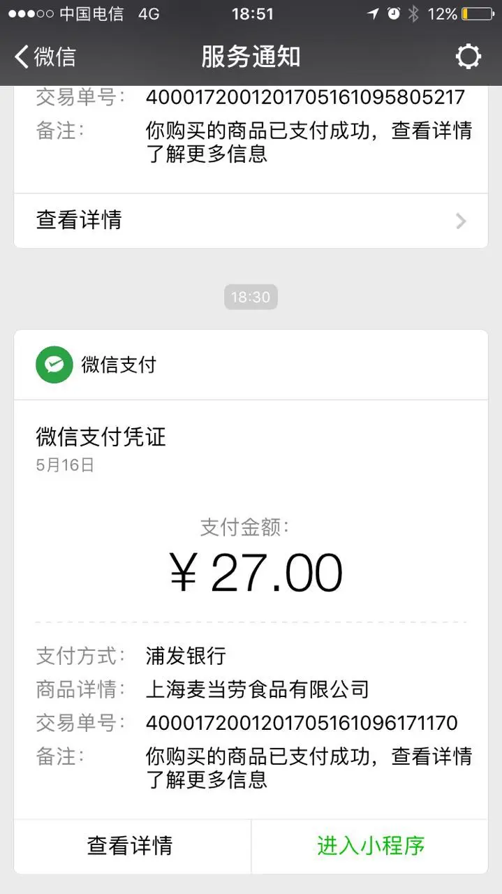 支付凭证也可以直接进入对应的小程序了。个人感觉这个能力有点神奇。上次去麦当劳吃汉堡,在收银台用微信扫码结的账,微信给我发了push支付消息,打开一看,居然可以直接进入到麦当劳的小程序中,这个有“二次营销”的嫌疑,😆。虽然我不能继续再吃一个汉堡了,但好奇心还是让我忍不住点了进去,从此麦当劳小程序在我的微信里“扎根”了。