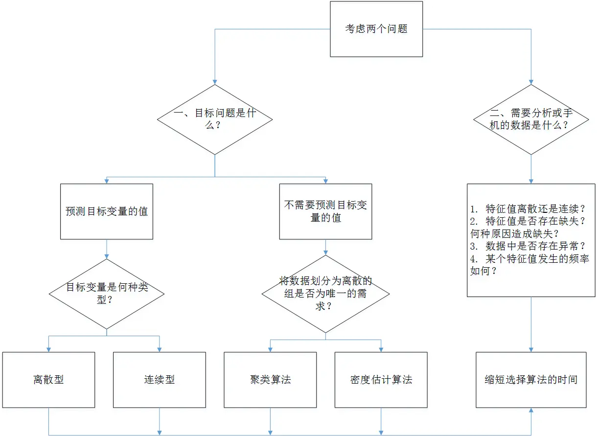 根据前面的描述,那么问题来了,如果给你一个问题,你改如何选择算法呢?是使用监督学习算法还是无监督学习算法?是使用分类问题?回归问题?聚类问题?还是密度估计问题?具体选择依据如下图所示,但是我们只能在一定程度上缩小算法的选择范围,哪种算法最优还需要不断尝试。