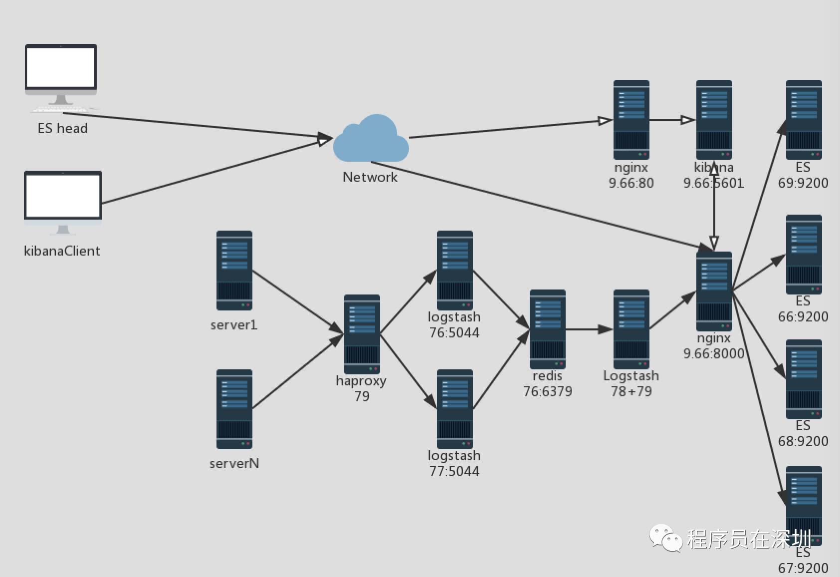 知道了docker这项技术后,便产生了马上把它用起来的想法,虽然我不知道它的全部细节,但我知道“那个地方”是一个“更好的世界”,先来看看在docker化之前我设计的ELK拓扑图: