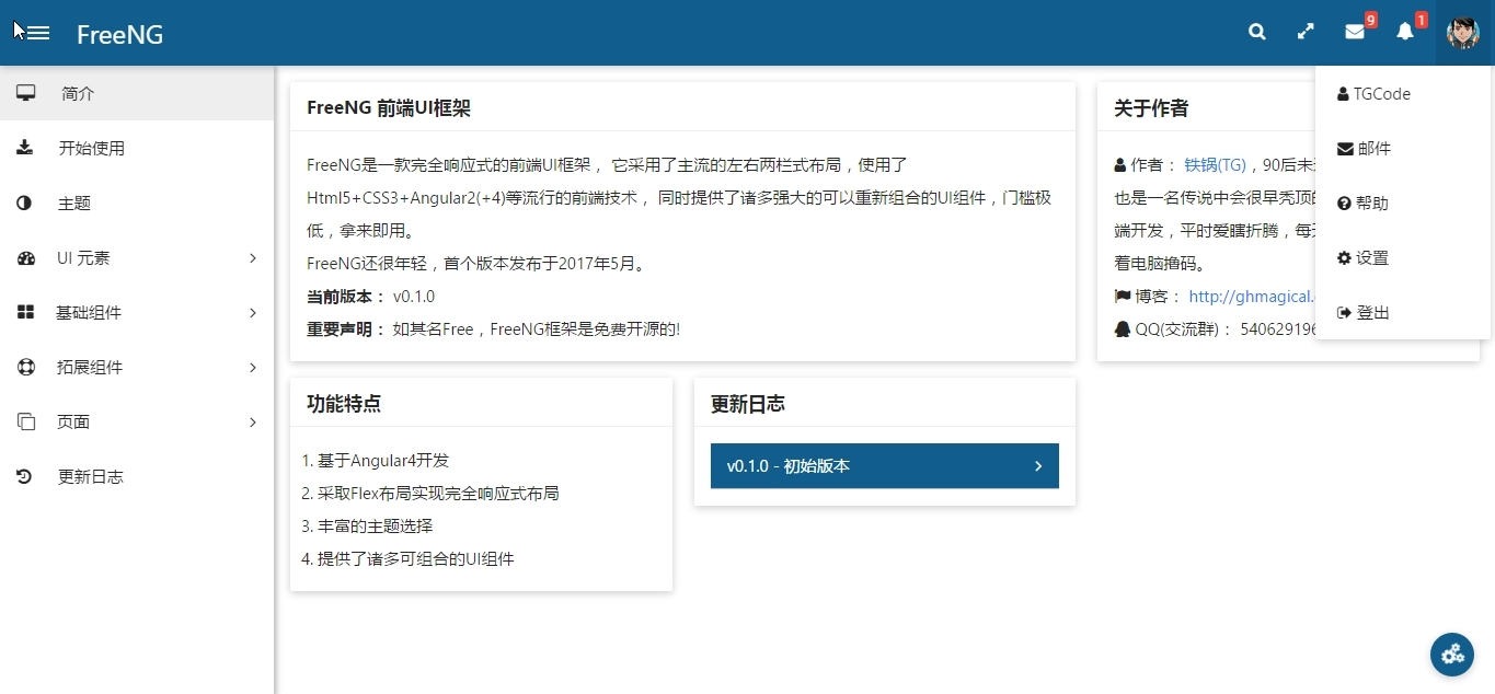 FreeNG | 基于 Angular4 的前端 UI 框架 铁锅 2017-05-21 1,500 阅读1分钟 原文链接: ghmagical.com FreeNG是一款完全响应式的前端UI框架,它采用了主流的左右两栏式布局,使用了Html5+CSS3+Angular2(+4)等流行的前端技术,同时提供了诸多强大的可以重新组合的UI组件,门槛极低,拿来即用。 Demo图: Github:从Github下载 在线预览:FreeNG在线预览 目前FreeNG正处于开发阶段(正在收集意见建议),如果发现Bug或有任何建议,欢迎各位大婶指正!