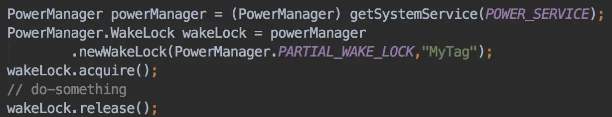 - PARTIAL_WAKE_LOCK : 使 CPU 保持高性能运行,而屏幕和键盘背光可以被关闭。通常推荐使用它。
