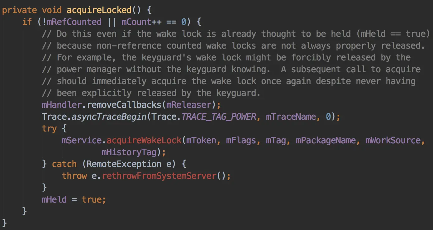 表示 mCount 会在调用之后自增 ,这样的语法表示只有在第一次 mCount 等于 0 的时候,才会命中 if 条件,执行 IPowerManager.acquireLocked() 方法。