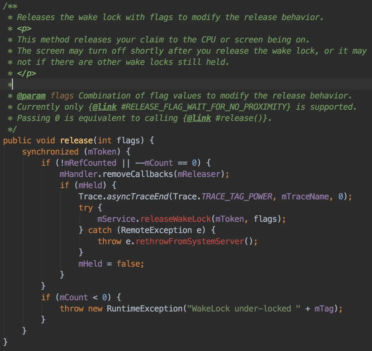 而在 release() 方法中,同样在 --mCount ==0 在判断 mCount 之前做了一个自减的操作,表示只有在最后一次 release() 才会真实的调用 IPowerManager.releaseWakeLock() 方法。