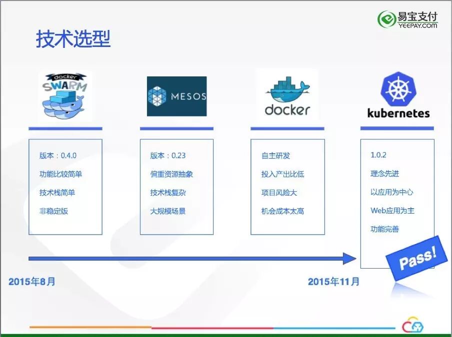 Swarm当时是0.4版本,功能还相对简单,优势是技术栈比较简单,小团队即可驾驭,但是考虑到它不是稳定版,虽然它发展很快,但是没有解决我们现有的问题,所以Swarm不被优先考虑。
