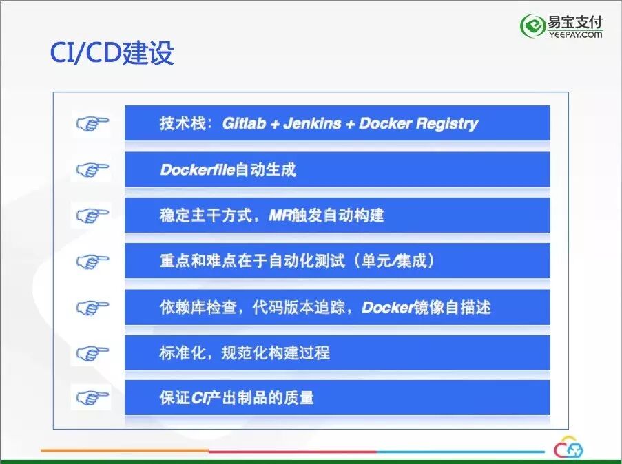本次分享为大家介绍易宝支付私有容器云从0到1的建设之路。包括技术选型、理论基础、基于Kubernetes的容器云和CI/CD落地过程中的挑战和踩过的坑。