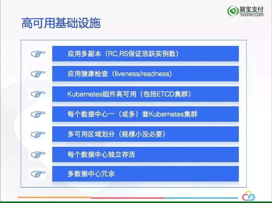 容器云要实现高可用的基础设施,能够支持多个数据中心。对于应用,要有多维度的高可用保证,要贯通部署流水线,通过CI/CD实现快速交付,另外,容器云的建设肩负的额外目标是要为未来2~4年的技术发展做铺垫,为应用的CloudNative改造和整个技术团队的DevOps实践奠定基础。