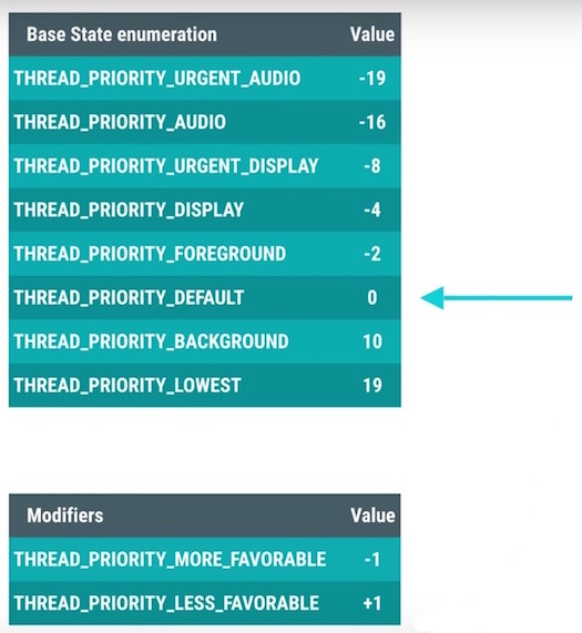 Linux中使用nice value来设定一个进程的优先级,系统任务调度器根据这个值来安排调度。而在Android中nice values被用在线程优先级上,高nice values(低优先级)的线程运行机会少于低nice values(高优先级)的线程。最重要的两个线程优先级是default和background。线程的优先级应该根据线程的工作量谨慎选择,简单来说,线程优先级应该和该线程期望完成的工作量相反。线程做的工作越多,它的优先级应该越小,以便它不会造成系统资源紧张。所以,UI线程(Activity的主线程)通常是default优先级,然而后台线程(AsyncTask的线程)通常是background优先级。