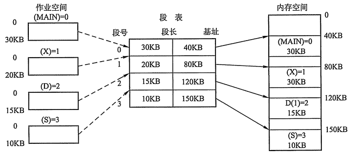分段内存管理当中,地址是二维的,一维是段号,一维是段内地址;其中每个段的长度是不一样的,而且每个段内部都是从0开始编址的。由于分段管理中,每个段内部是连续内存分配,但是段和段之间是离散分配的,因此也存在一个逻辑地址到物理地址的映射关系,相应的就是段表机制。段表中的每一个表项记录了该段在内存中的起始地址和该段的长度。段表可以放在内存中也可以放在寄存器中。