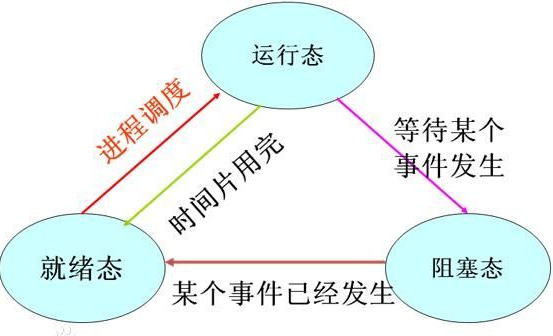 阻塞状态 -> 就绪状态:当进程等待的事件到来时,如I/O操作结束或中断结束时,中断处理程序必须把相应进程的状态由阻塞状态转换为就绪状态。