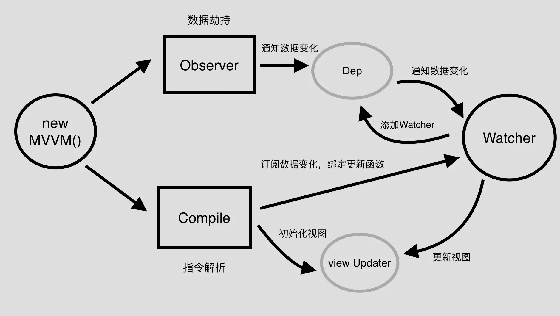 要实现一个我们自己的mvvm库,我们首先需要做的事情不是写代码,而是整理一下思路,捋清楚之后再动手绝对会让你事半功倍。先上流程图,我们对着流程图来捋思路
