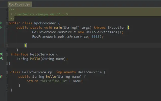 如上图所示,服务器端发布一个接口服务 HelloService,客户端成功通过 RPC 调用。