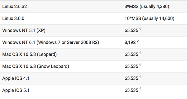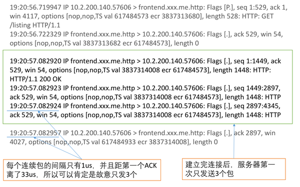 可以看到,服务在收到一个GET请求后进行响应,第一次同时只发3个包,并且从时间间隔上我们可以肯定它是故意的。也就是说它是一个慢启动,为什么第一次是3个呢,因为Linux 2的系统的初始化拥塞窗口initcwnd为3MSS,3MSS说明第一次只能发3个包(每个包不能超过最大报文段的长度),不同操作系统的initcwnd值如下所示,参考:<img data-rawwidth="1070" data-rawheight="566" src="https://pic1.zhimg.com/v2-8b624b86e89b68b500cd1c4971dcd760_b.png" class="origin_image zh-lightbox-thumb" width="1070" data-original="https://pic1.zhimg.com/v2-8b624b86e89b68b500cd1c4971dcd760_r.png">